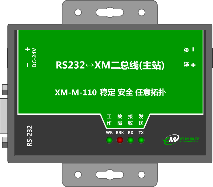 二总线是一种相对于四线系统(两根供电线路、两根通讯线路),将供电线与信号线合二为一,实现了信号和供电共用一个总线的技术。二总线节省了施工和线缆成本,给现场施工和后期维护带来了极大的便利。在消防,仪表,传感器,工业控制等领域广泛的应用。 XM2BUS为您提供全面二总线解决方案,我们为您提供主站设备及节点IC(SOP8封装),与485电路一样简单;您不再需要为主站电路设计复杂,节点电路调试麻烦而烦恼;XM2BUS具有总线供电电流大、通信距离远、任意拓扑特点,极度方便现场施工;广泛应用于应用场合:消防、远程抄表、智能楼宇、传感器网络、自动化控制等领域。 XM2BUS领先国际技术的两大特点(支持满额额定负载启动) 说明:总线接口标识正负,以指示输出电压,XM2BUS设备自身总线接线不区分极性,可随意连接;供电DC-24V必须按正负接线。