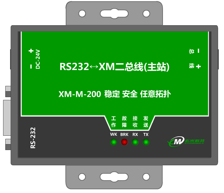主要为232转总线设备,232接口一般直接与嵌入式主机连接;将232信号转换为XM2BUS总线信号,总线设备通过主站供电;总线电流可达3A,可携带256个节点。